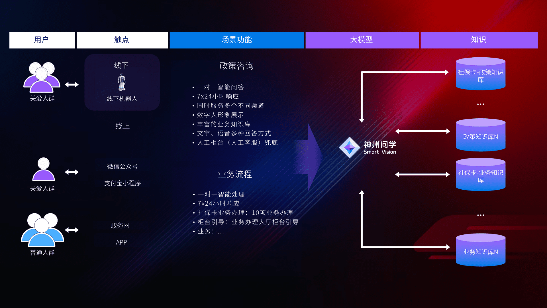 • 线上线下全覆盖:线上提供微信公众号、、、支付宝小程序、、、、政务网、、、、app多种渠道,,与线下机器人形成完整服务体系。。。。